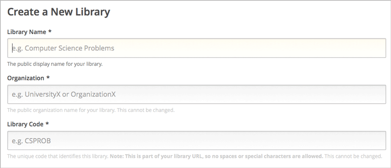 For Library Name, enter the public display name for your legacy library. Choose a meaningful name that will help you and other course team members to identify the legacy library. For example, “Level 200 Math Problems”. When you add a randomized content block to a course unit, you use the legacy library name to specify this legacy library as a source for the randomized assignment.