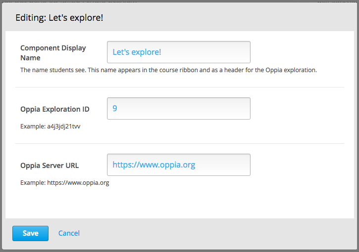 You must enable the Oppia exploration tool before you add a component with an exploration to your course. You must also select the Oppia exploration that you want to add, and obtain both the URL of the website that hosts that exploration and its ID.