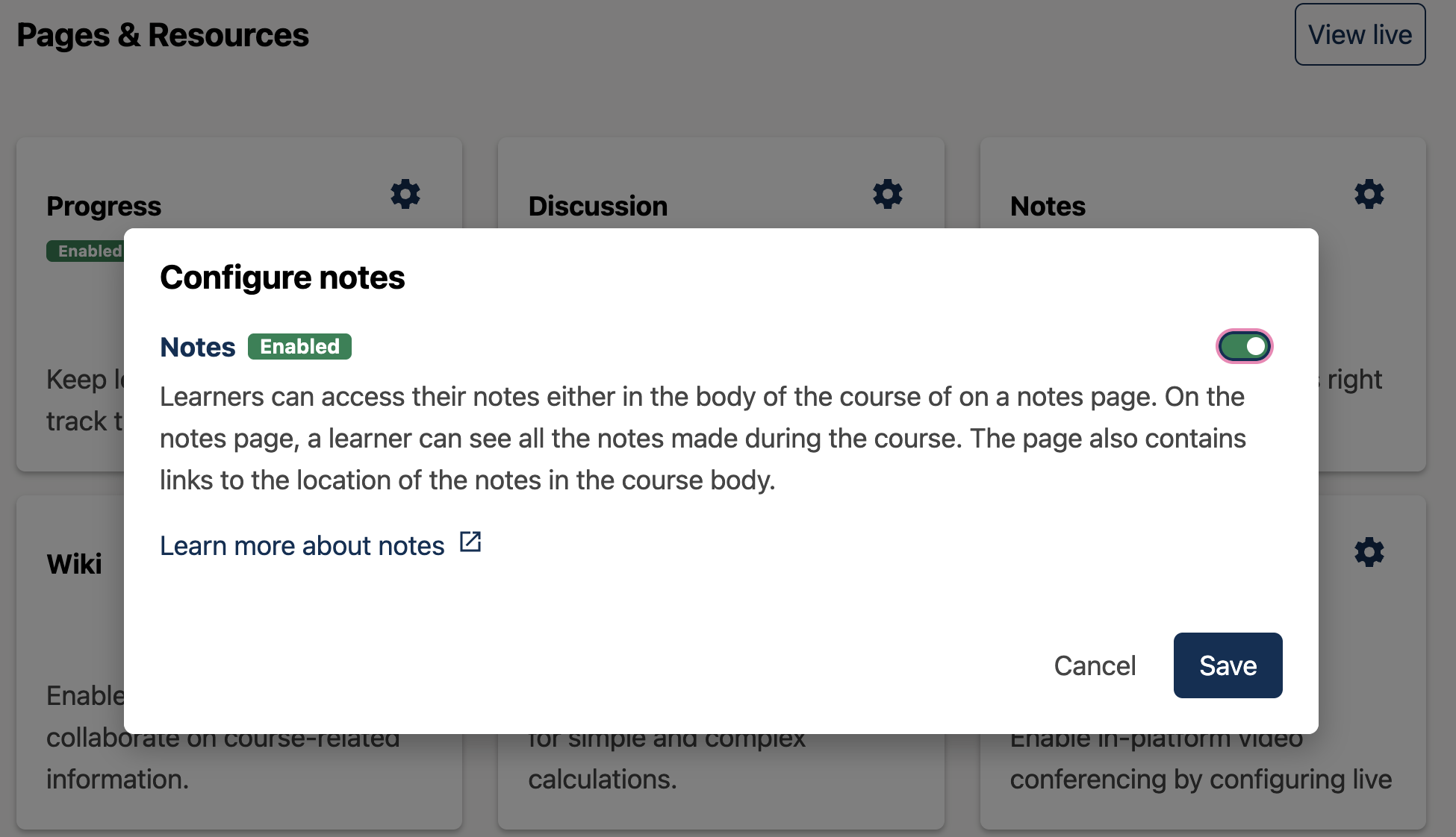 You must enable the Notes tool before learners can use it. To enable the Notes tool, follow these steps.