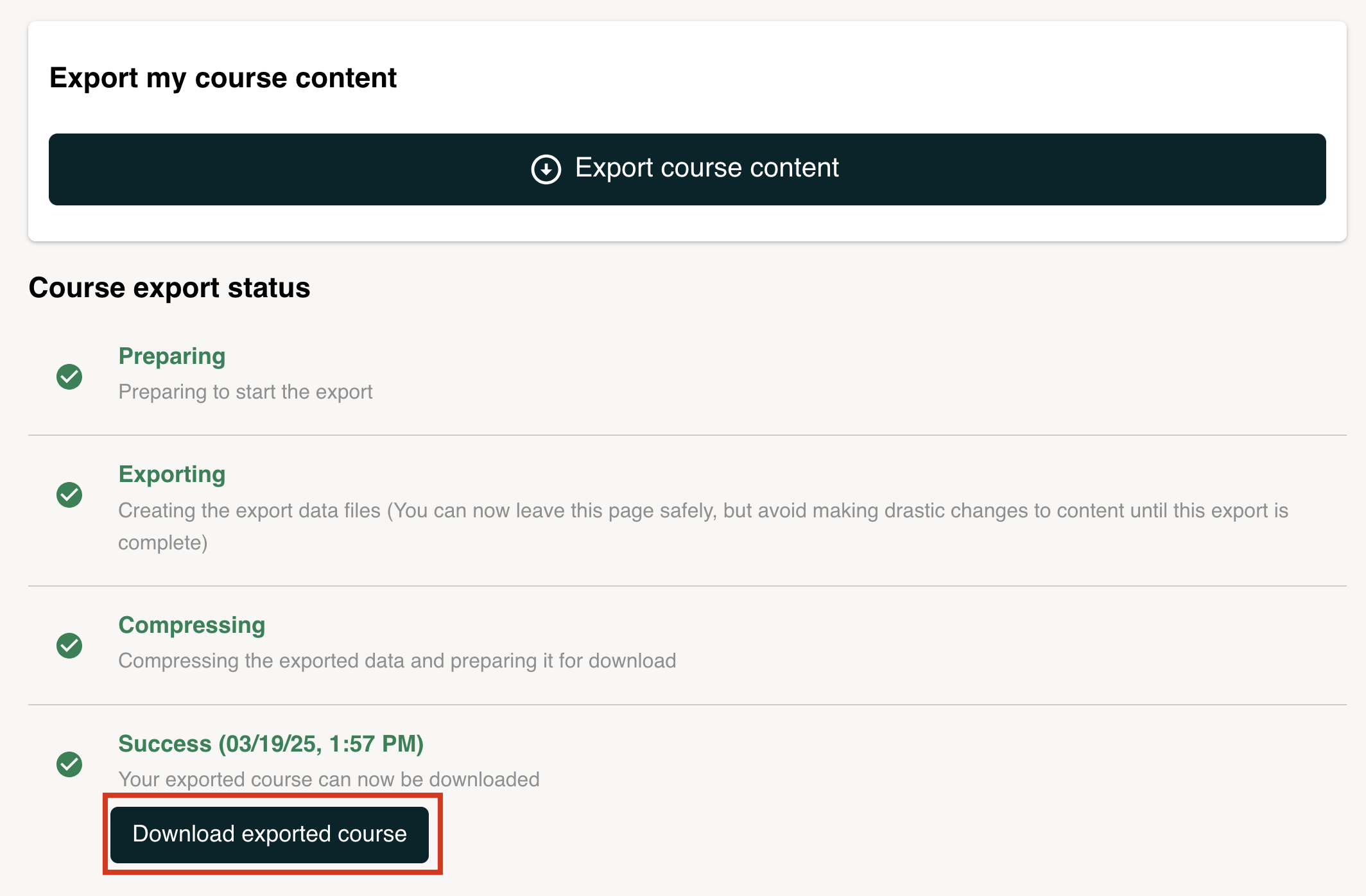 When the export is complete, click Download Exported Course.