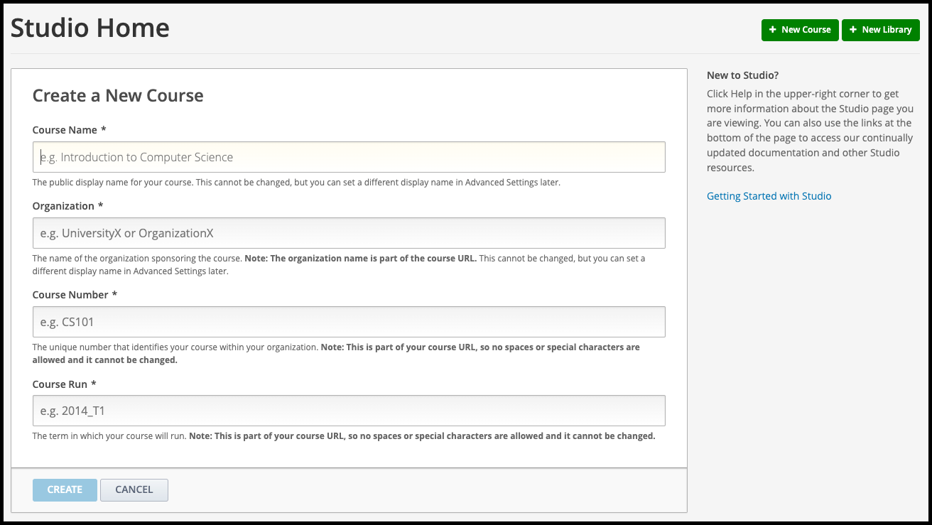 The Organization, Course Number, and Course run values you enter when creating a course are part of the learner-visible course URL and cannot be changed. The base URL for the new course is in the format:
